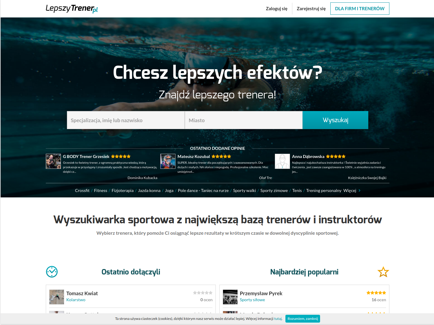 Tworzona przez nas od postaw strona z katalogiem trenerów oraz instruktorów. Zaimplementowaliśmy tutaj między innymi wyszukiwanie z użyciem mapy google, interaktywny kalendarz treningów oraz obsługę masowej korespondencji.