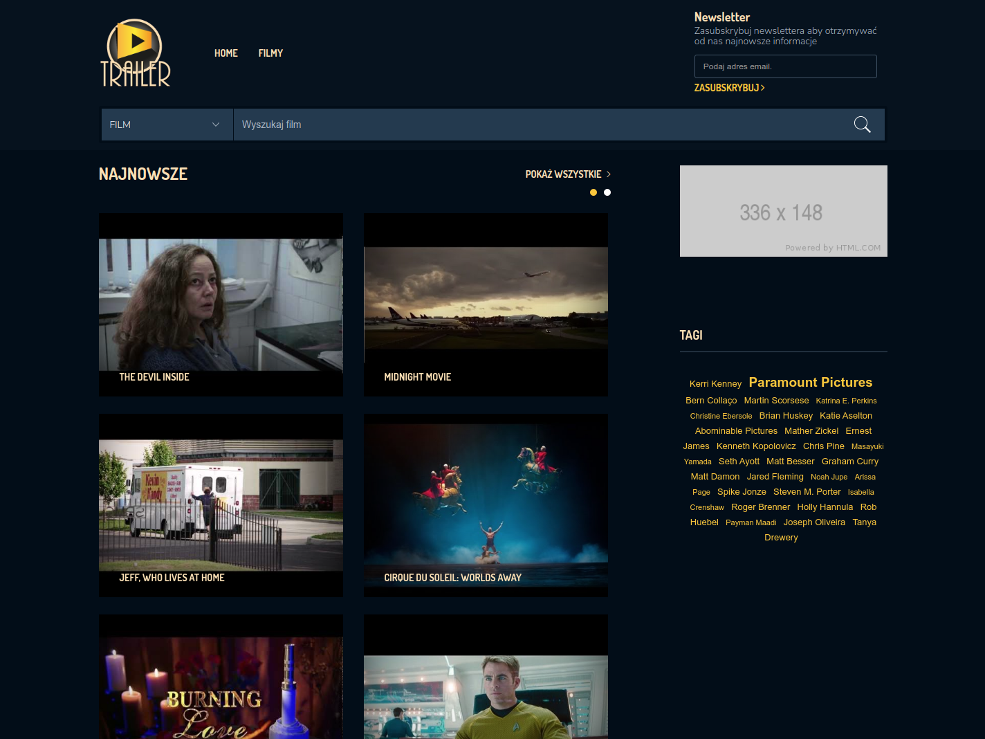 Stworzona przez nas od postaw strona, oparta o nasz autorski CMS, dodająca automatycznie trailery najnowszych filmów, bazując na danych udostępnianych przez wskazane kanały Youtube.